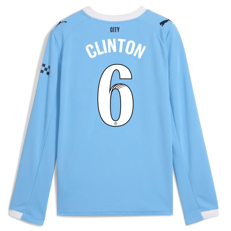 Kids’ Manchester City Home Jersey 2025/26 Long Sleeve With CLINTON 6 Printing