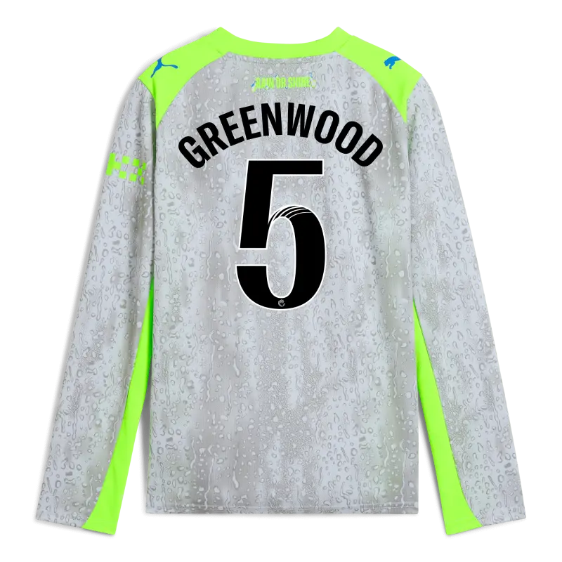 Kids’ Manchester City Third Jersey 2025/26 Long Sleeve With GREENWOOD 5 Printing
