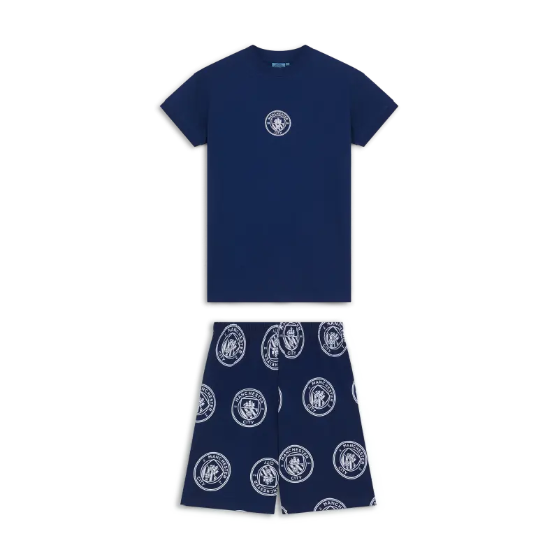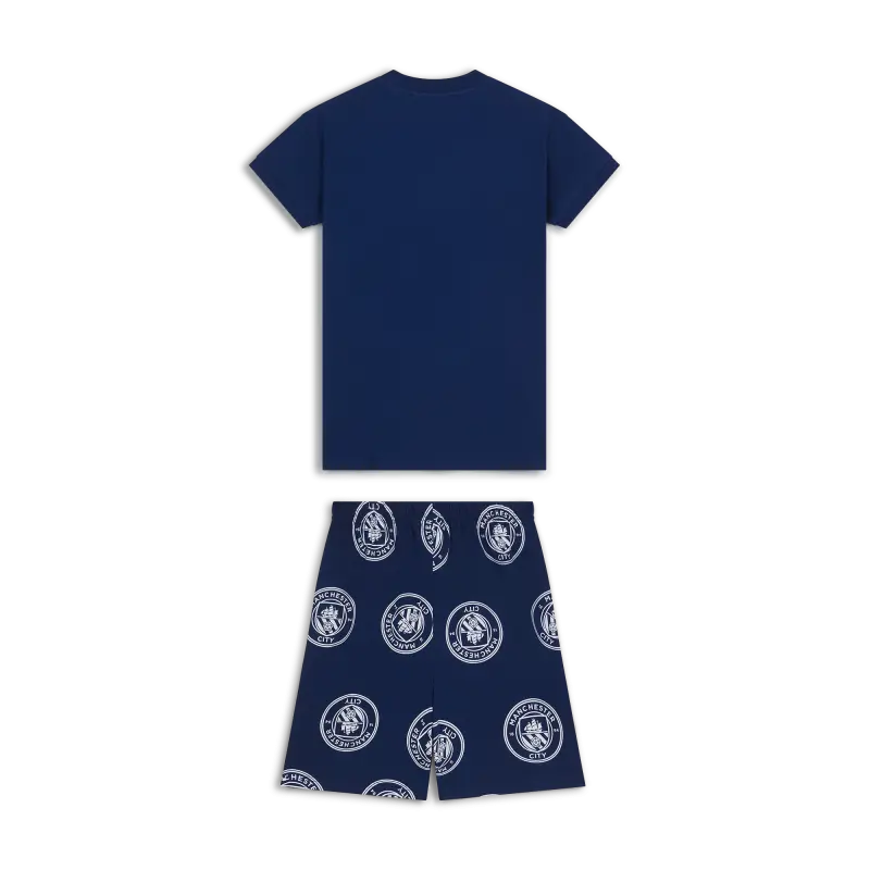 The Kids’ Manchester City Crest Pyjama Set offers cosy comfort in 100% cotton, featuring a playful all-over crest print—perfect for young fans to relax or sleep in true City style.