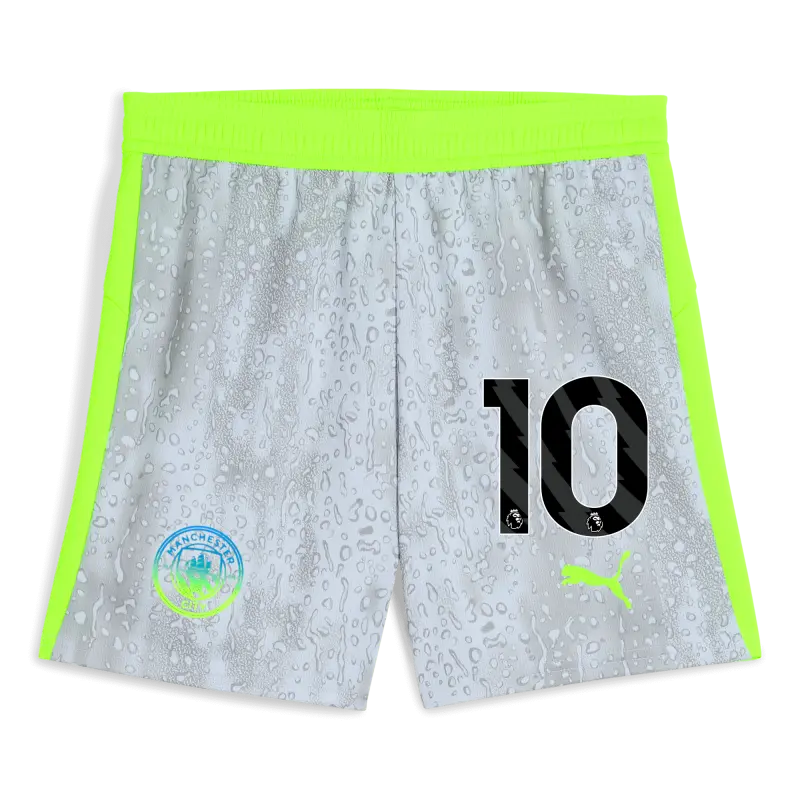 The Kids’ Manchester City Football Shorts 2025/26 blend style and performance. Featuring dryCELL sweat-wicking technology to keep young fans dry and cool during training. The regular fit and elasticated waistband with integrated drawcord ensure a secure, adjustable feel. Curved side seams enhance movement and flexibility on or off the pitch. Finished with the Manchester City crest on the right leg and PUMA Cat logo on the left, these shorts carry the team spirit. Made to stand out with an unique rain-inspired print. Man City are a symbol of the people, the culture, and the humour of Manchester. That’s why the 25/26 Third Kit is a tribute to Mancunian weather, designed for those who carry City in their hearts, rain or shine (Though, let’s be honest, mostly rain).