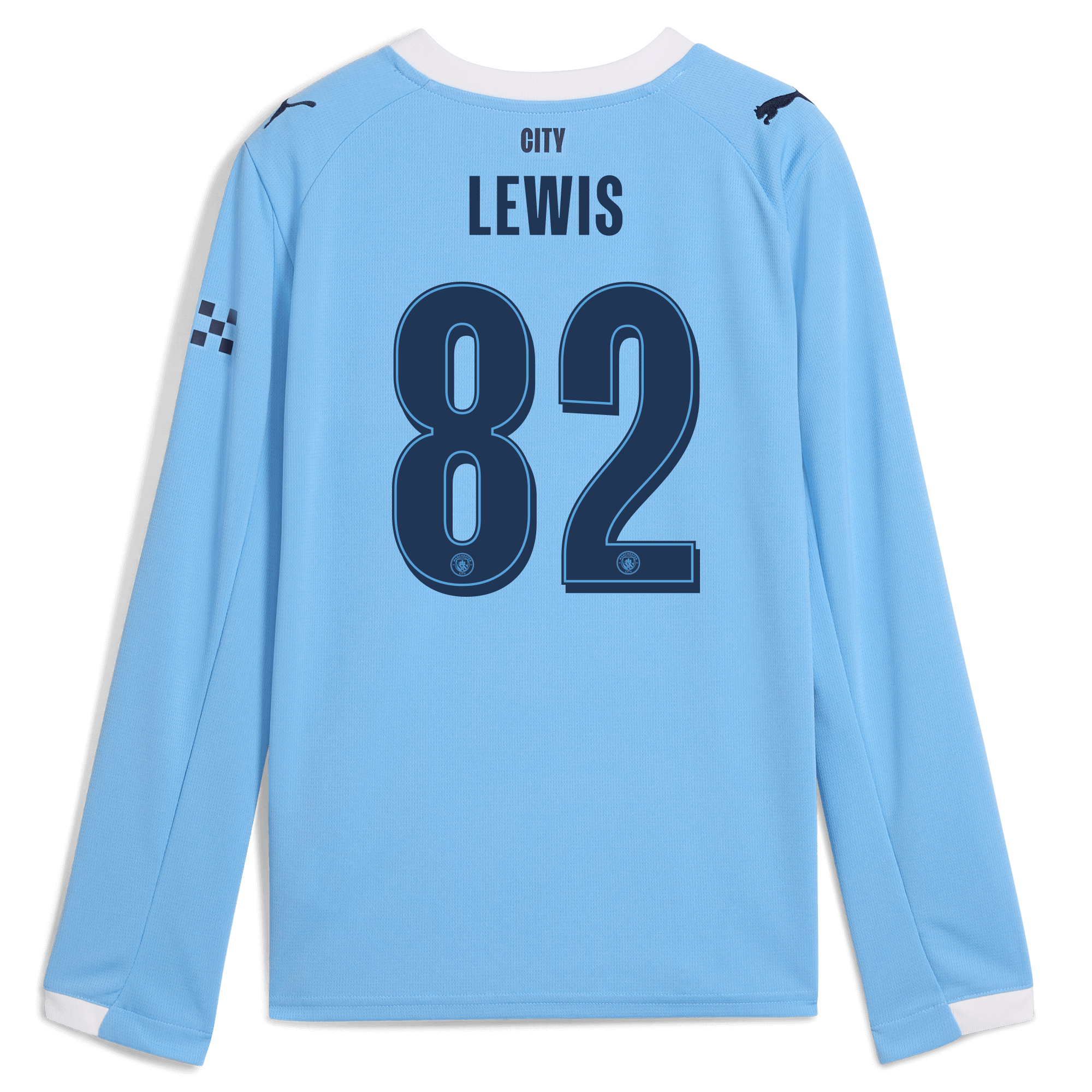 Kids’ Manchester City Man City Home Jersey 2025/26 Long Sleeve With LEWIS 82 Printing