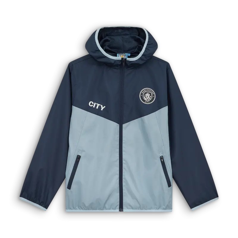 The Kids’ Manchester City Showerproof Jacket offers waterproof protection with PVC-coated polyester, featuring a raised rubber crest, elastic bindings, and handy pockets—perfect for keeping young fans dry and comfortable.