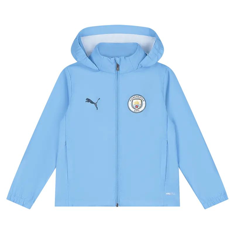 Keep young fans dry and comfortable with the Kids’ Manchester City Training All Weather Jacket 2025/26. Engineered with PUMA’s rainCELL technology, this jacket protects against the rain while offering breathable comfort during training. The water-repellent woven stretchy fabric ensures flexibility, while elasticated cuffs and adjustable hood with elastic cords and stopper provide a secure fit. A collar with hidden hood and velcro opening adds extra versatility. Finished with the Manchester City crest and PUMA Cat logo, it’s the perfect all-weather layer for aspiring City stars.