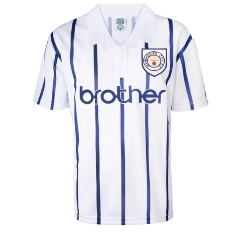 This iconic Manchester City 1993 Away shirt is more than just another shirt. It celebrates year’s of the club’s victories and has played a huge part in the evolving of the club. Be the talk of the town in this vertical stripe blue and white match shirt featuring the proud Brother sponsor branding and Man City club crest. PLAY FOREVER.