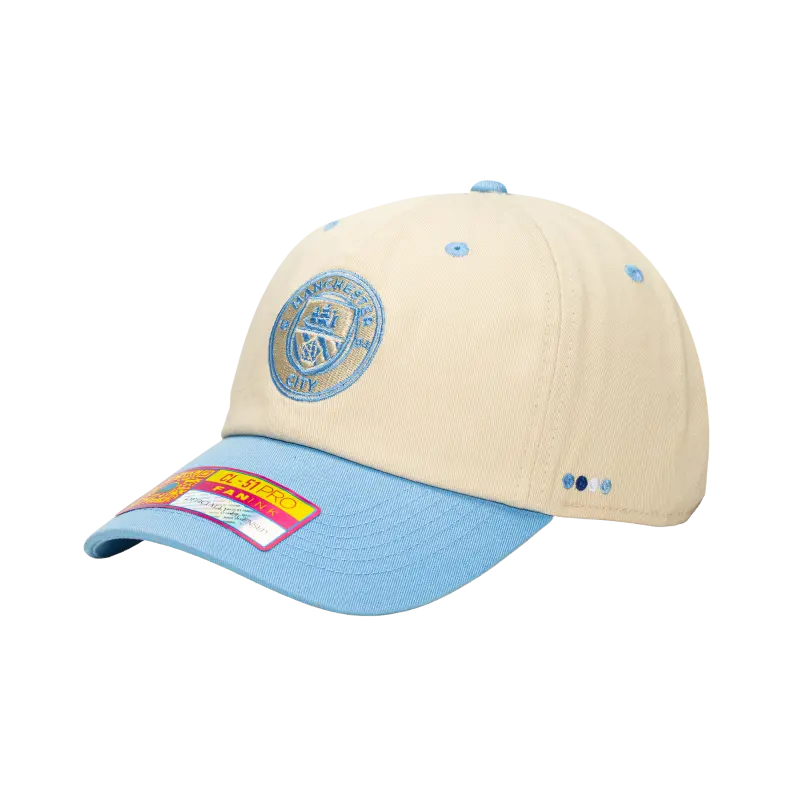 The Manchester City Contrast Cap, made from 100% cotton twill, features an embroidered crest, side detail, curved peak, and adjustable buckle—ideal for Cityzens wanting comfort and style while showing their pride.