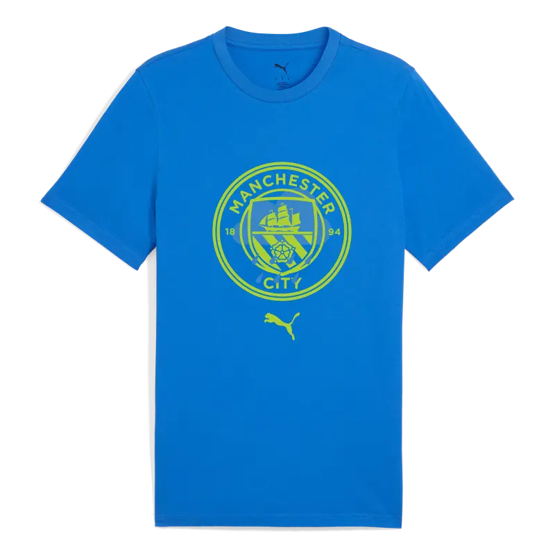 The Manchester City Ftblculture Tee combines comfort and style. Made from 100% cotton, it offers a regular fit and features the Manchester City crest and PUMA Cat logo in a bold rubber print on the chest. With short sleeves and a timeless design, this tee is a must-have for any City fan.