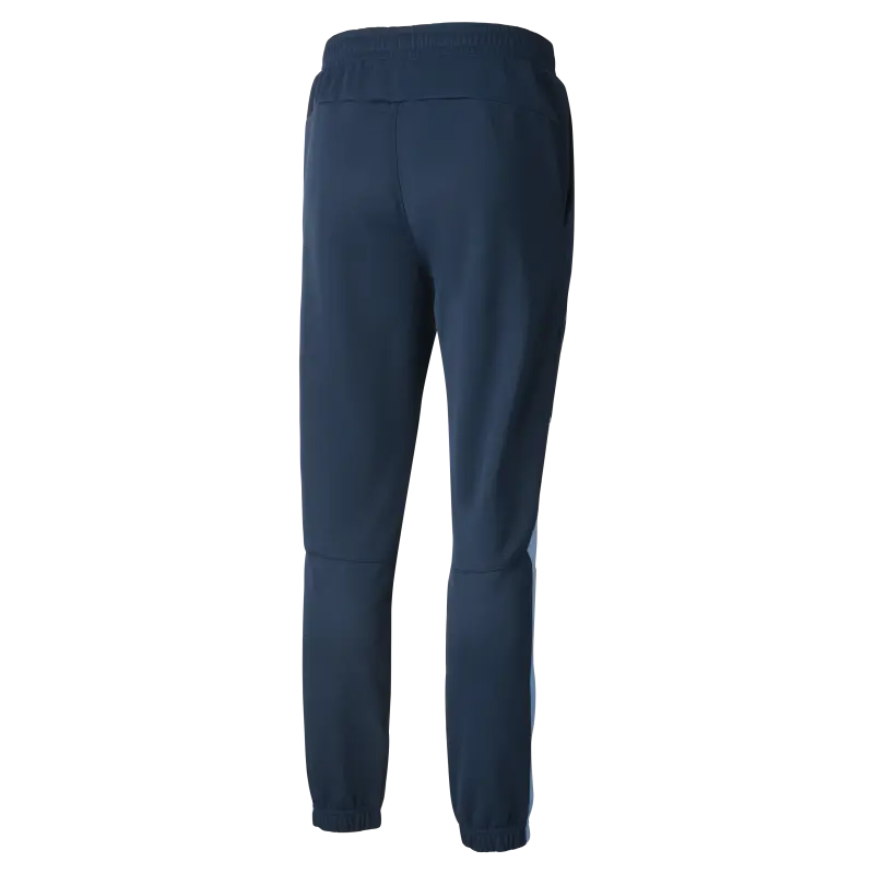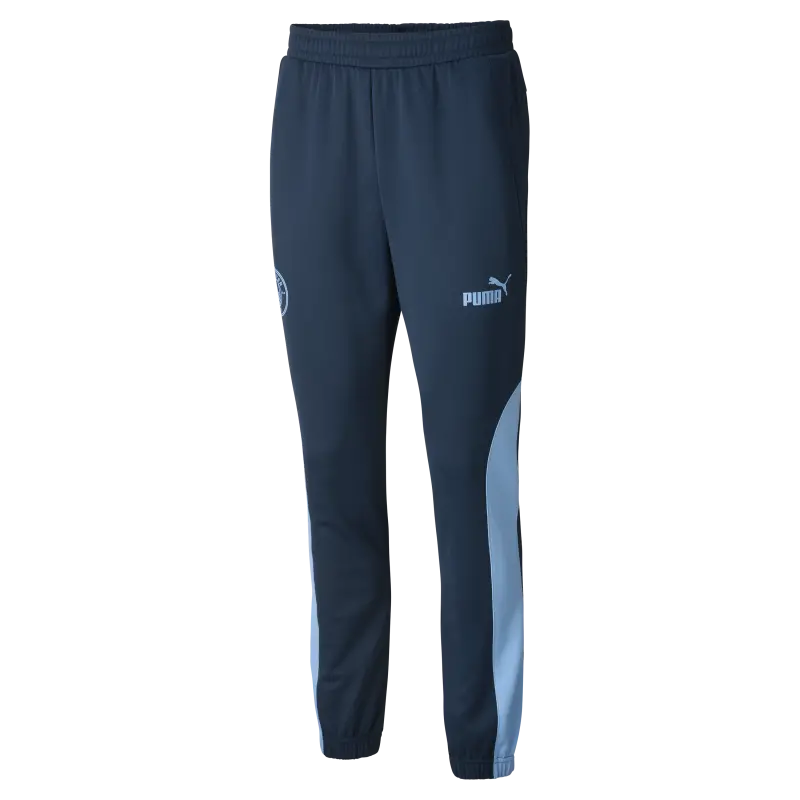 We present the Manchester City FtblNrgy+ Pants. The perfect fusion of comfort and team pride. Designed with a relaxed fit, elasticated waistband, and flatlock stitching to prevent bulk and friction. Made of cotton woven ripstop for increased durability, it makes a statement with bold contrasting panels, proudly showcasing the iconic Manchester City club crest and PUMA logo.