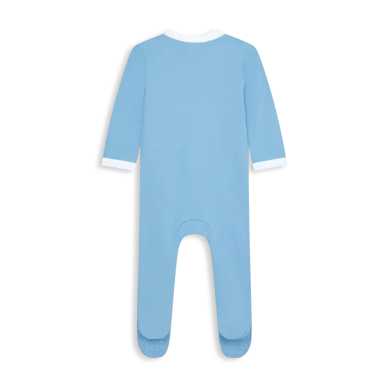 The Manchester City Home Baby Sleepsuit 2025/26 is made from soft 100% cotton for comfort. Featuring the club crest, it has popper fastenings for easy dressing—perfect for little City fans.