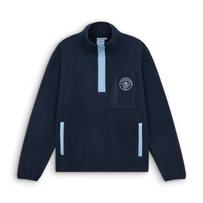 The Manchester City Quarter Zip Fleece offers cosy 300gsm polyester microfleece warmth with an embroidered crest, chest pocket, and hand pockets—ideal for layering in comfort while proudly displaying your City spirit.